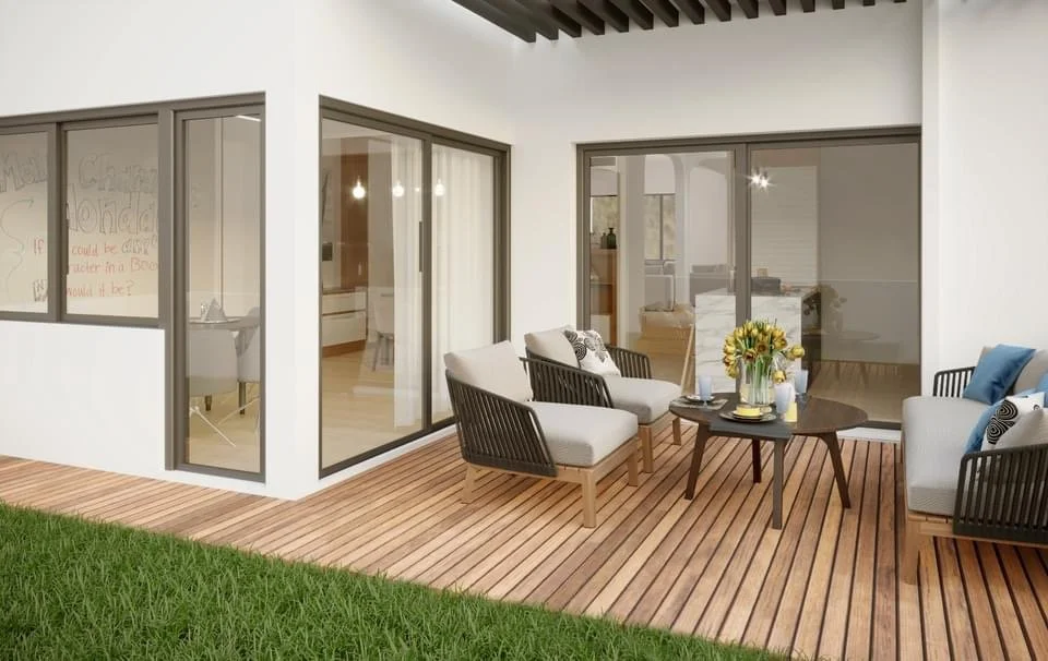 A cozy deck provides a peaceful oasis right at your doorstep, where you can unwind surrounded by lush greenery and vibrant blooms.