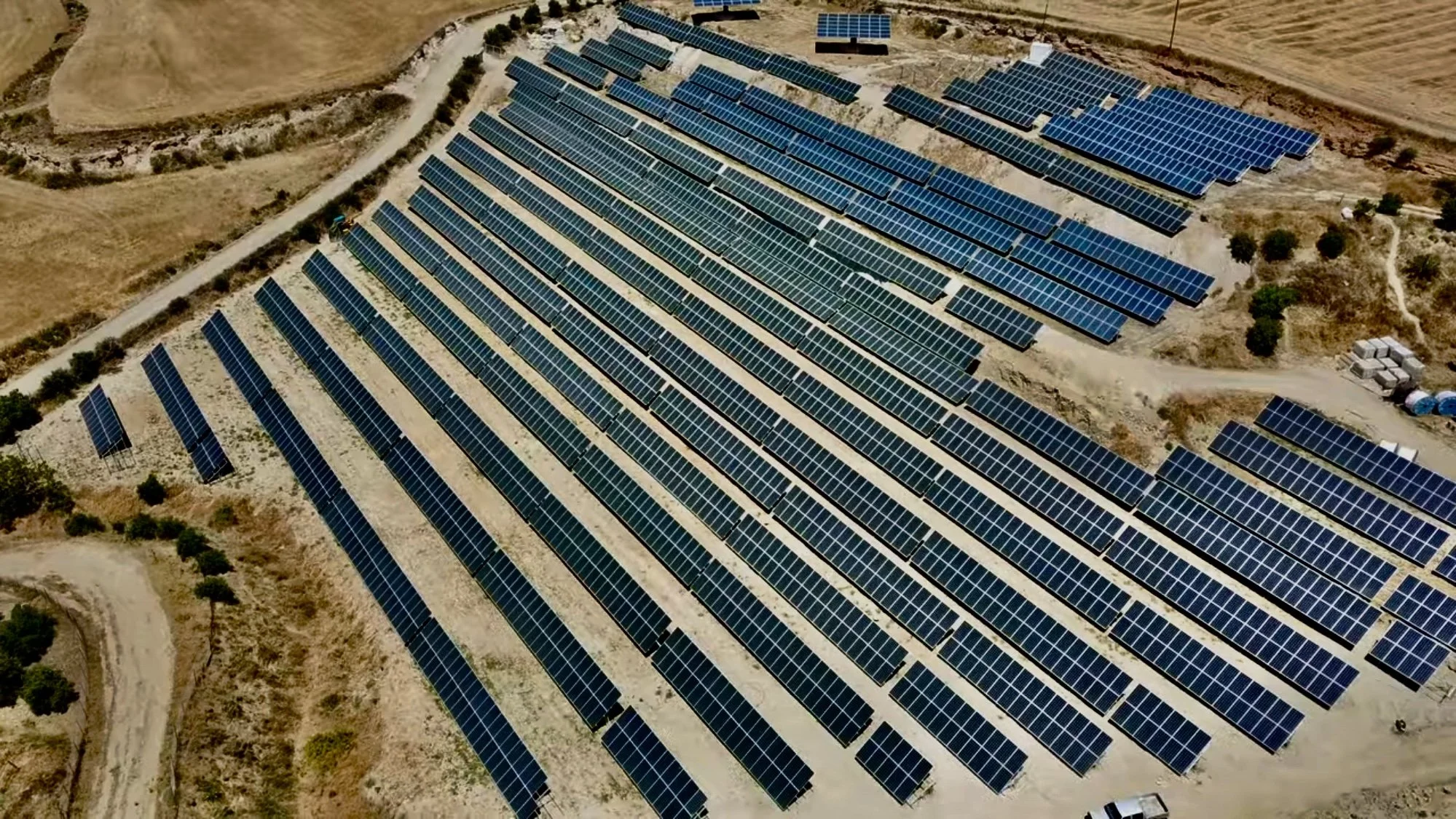 This aerial view shows a 1MW solar PV park in Cyprus, featuring rows of photovoltaic panels that minimize shading and maximize energy yield. The layout contributes clean power to the local grid, reflecting the island's commitment to renewable energy and sustainable sunlight harnessing.